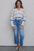 This autumn sweater features a ribbed wide collar with a V-slit accent and distinctive stripes in oatmeal and blue shades, making it perfect for a stylish and comfortable transition from fall to winter. Crafted with exceptional quality by by FATE.